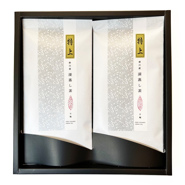 [ギフト・お箱に包装紙/のし紙orリボン対応]掛川産 深蒸し茶【特上 日輪】茶葉90g×2 *コクと甘みが際立つ深蒸し「特上茶」の贈り物。〈お箱・ラッピング代込み〉