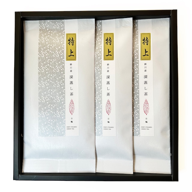 [ギフト・お箱に包装紙/のし紙orリボン対応]掛川産 深蒸し茶【特上 日輪】茶葉90g×3 *コクと甘みが際立つ深蒸し「特上茶」の贈り物。〈お箱・ラッピング代込み〉